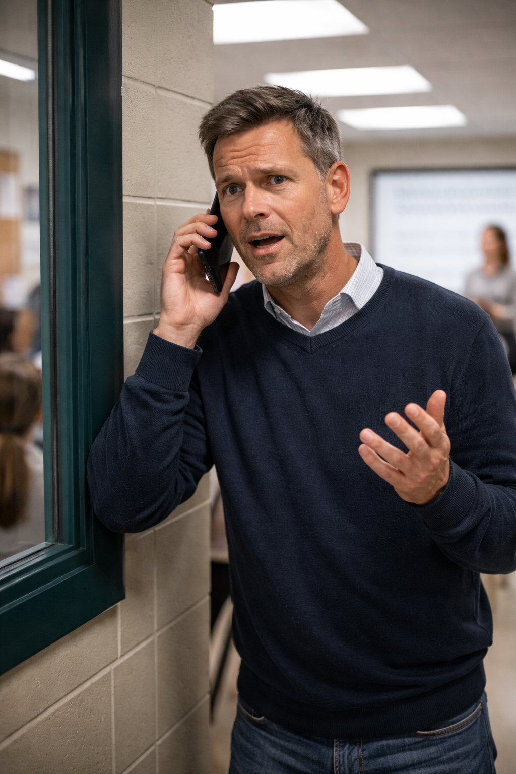 Zelf richt ik me in eerste instantie op de kinderen. Ik praat ook wel met ouders, maar die kinderen komen bij mij in de klas. Collega’s doen dat ook, merkte ik. Toen ik halverwege de avond even op de gang stond, weg van de drukte, ging de deur van het lokaal tegenover mij open en kwam er een man naar buiten, telefoon aan zijn oor.